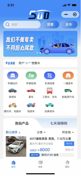 《500拍車(chē)》是一款為閑置二手車(chē)提供交易平臺(tái)的小程序,在500拍車(chē)小程序中,用戶(hù)可以設(shè)置自己關(guān)注的車(chē)輛類(lèi)型,隨時(shí)隨地獲取最新的車(chē)輛消息推送;同時(shí)用戶(hù)可以自己成為獨(dú)立商家,發(fā)布自己的閑置二手車(chē)信息,供大家進(jìn)行競(jìng)拍搶購(gòu);同時(shí)用戶(hù)通過(guò)小程序可以實(shí)現(xiàn)車(chē)輛估價(jià)功能,可以在賣(mài)車(chē)或者買(mǎi)車(chē)之前先了解相關(guān)車(chē)輛的價(jià)格信息,讓二手車(chē)的價(jià)格更加透明;同時(shí)小程序提供車(chē)輛檢測(cè)功能,隨時(shí)了解車(chē)輛的安全信息,防止二手車(chē)存在事故、火燒、水泡等安全風(fēng)險(xiǎn);同時(shí)用戶(hù)還可以在車(chē)源線索功能中了解到自己心儀車(chē)輛的相關(guān)信息;在雙方交易時(shí)采取雙方線下見(jiàn)面交易,不存在中間商賺差價(jià)的行為,這樣保證了二手車(chē)價(jià)格的公開(kāi)透明性,也保證了雙方交易資金的安全,用優(yōu)質(zhì)的服務(wù)留住用戶(hù),保證了小程序擁有穩(wěn)定的用戶(hù)群體,同時(shí)提升了小程序的口碑以及傳播度,為小程序長(zhǎng)期發(fā)展打下堅(jiān)實(shí)基礎(chǔ)。