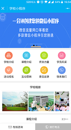 培訓(xùn)教育行業(yè)可以算得上是比較賺錢(qián)的行業(yè)了,因?yàn)榇蠹叶贾罒o(wú)論是搞線下培訓(xùn)還是線上培訓(xùn),只要你能獲得大量的培訓(xùn)客戶(hù),你必將賺錢(qián),因?yàn)閷?duì)培訓(xùn)學(xué)校來(lái)說(shuō),培訓(xùn)一個(gè)金額培訓(xùn)十個(gè)都是一樣的。所以,培訓(xùn)學(xué)校必將也會(huì)抓住現(xiàn)在的新潮-小程序開(kāi)發(fā)。 成都小程序開(kāi)發(fā)龍兵科技,最近開(kāi)發(fā)的培訓(xùn)學(xué)校小程序做了個(gè)培訓(xùn)行業(yè)的通用解決方案。 打開(kāi)培訓(xùn)學(xué)校小程序的首頁(yè)可以看見(jiàn),學(xué)校介紹、課程介紹、師資力...
