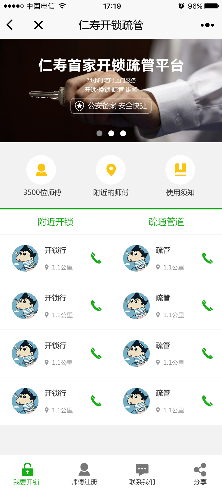 項目名稱:仁壽開鎖小程序所屬類型:微信小程序項目設(shè)計周期:20天??仁壽開鎖小程序是一款標準的開鎖換鎖平臺小程序,具備在微信群,好友,朋友圈分享傳播的功能,無需下載、即可微信賬號自動授權(quán)登錄使用,也可以注冊賬號使用,開鎖師傅快捷注冊入住平臺、用戶快速撥打電話預(yù)約師傅。??仁壽市民可以通過微信-發(fā)現(xiàn)-附近小程序,找到并訪問開鎖小程序,用戶分享小程序給微信好友,生成小程序圖標到手機桌面上,好友可以點擊進入...